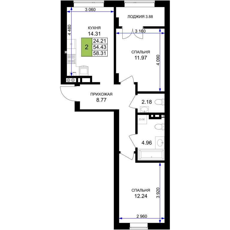 Жилая площадь 24.21 м2, кухня 14.31 м2, предчистовая отделка.