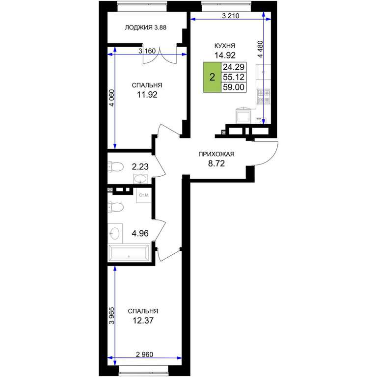 Жилая площадь 24.29 м2, кухня 14.92 м2, предчистовая отделка.