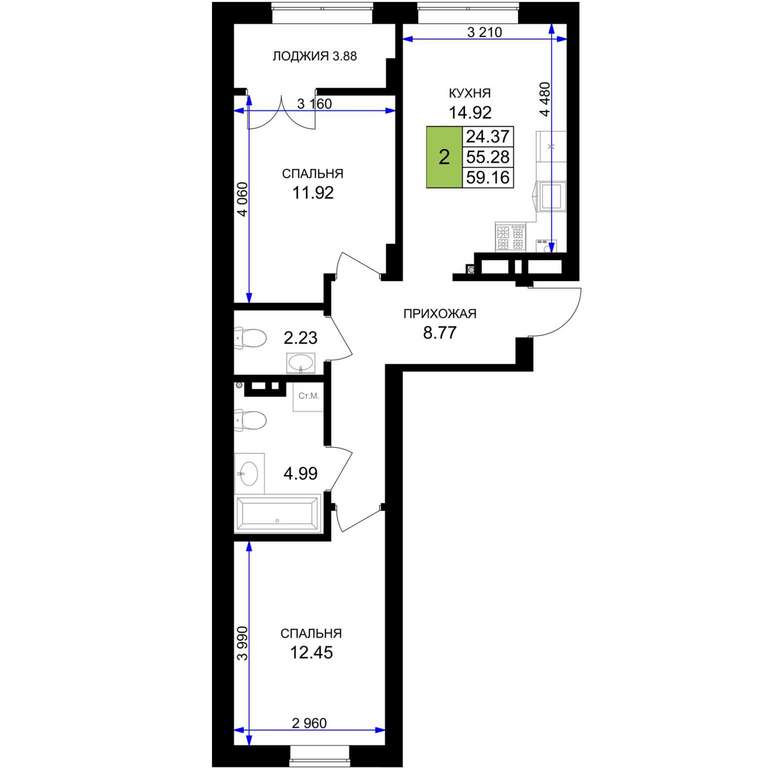 Жилая площадь 24.37 м2, кухня 14.92 м2, предчистовая отделка.