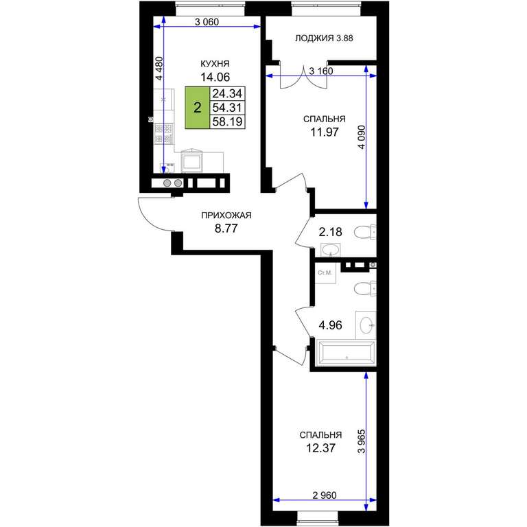 Жилая площадь 24.34 м2, кухня 14.06 м2, предчистовая отделка.