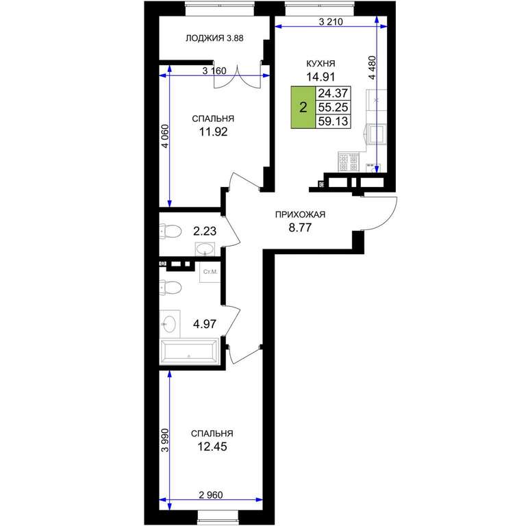 Жилая площадь 24.37 м2, кухня 14.91 м2, предчистовая отделка.