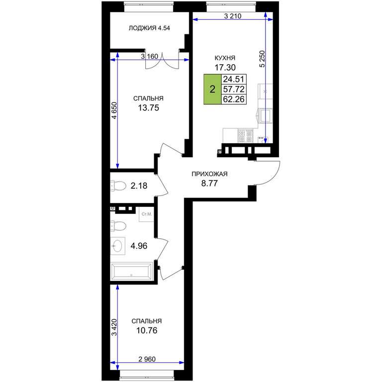 Жилая площадь 24.51 м2, кухня 17.3 м2, предчистовая отделка.