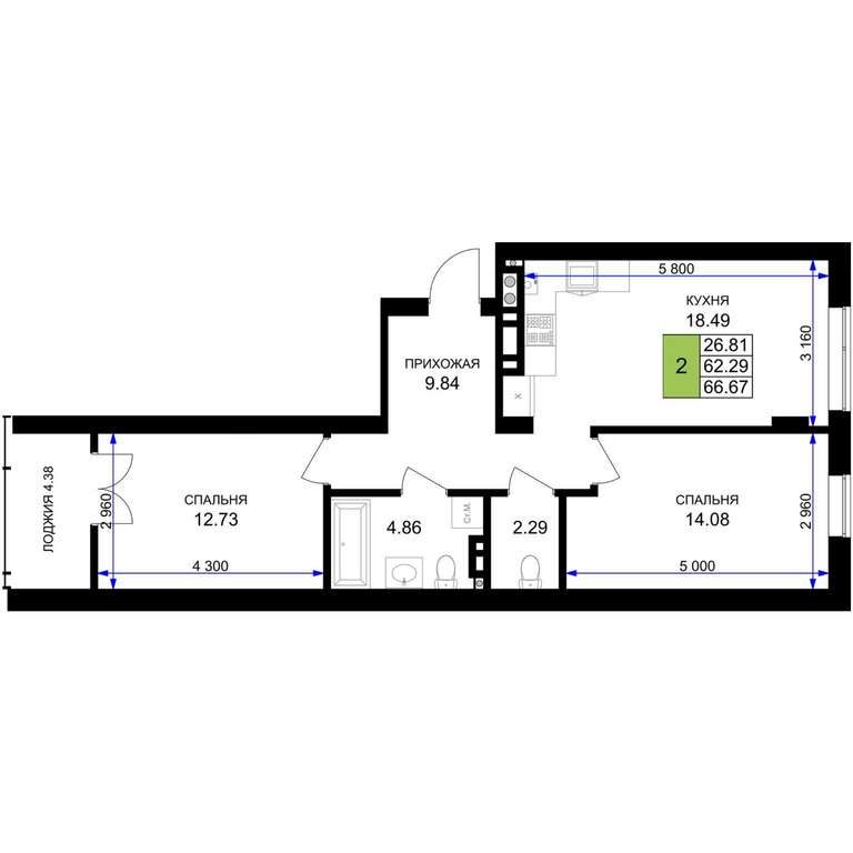Жилая площадь 26.81 м2, кухня 18.49 м2, предчистовая отделка.