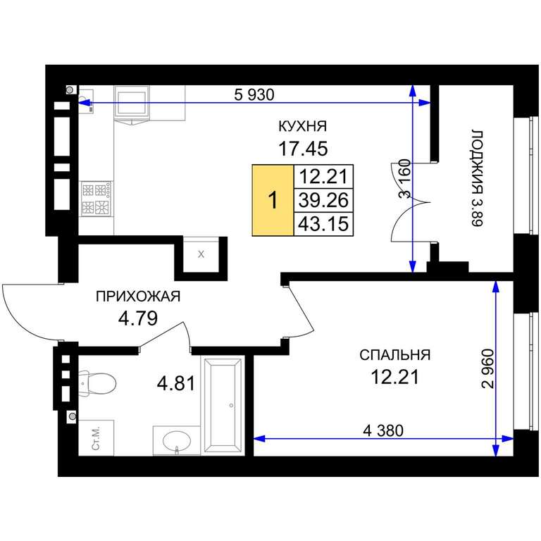 Жилая площадь 12.21 м2, кухня 17.45 м2, предчистовая отделка, комнаты изолированные.