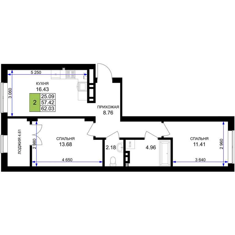 Жилая площадь 25.09 м2, кухня 16.43 м2, предчистовая отделка.