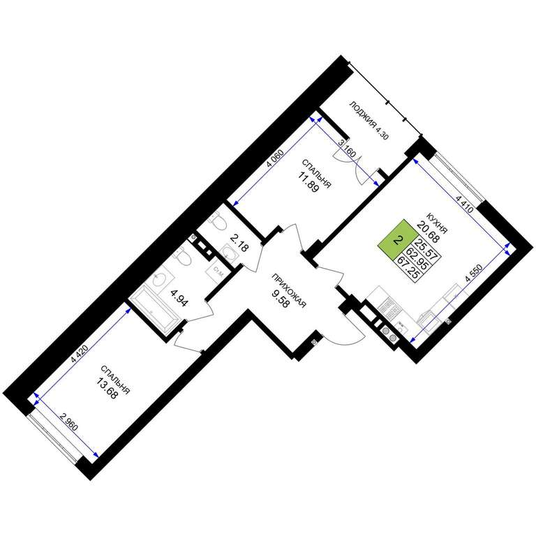 Жилая площадь 25.57 м2, кухня 20.68 м2, предчистовая отделка.