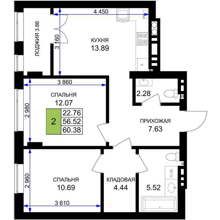 Жилая площадь 22.76 м2, кухня 13.89 м2, предчистовая отделка.