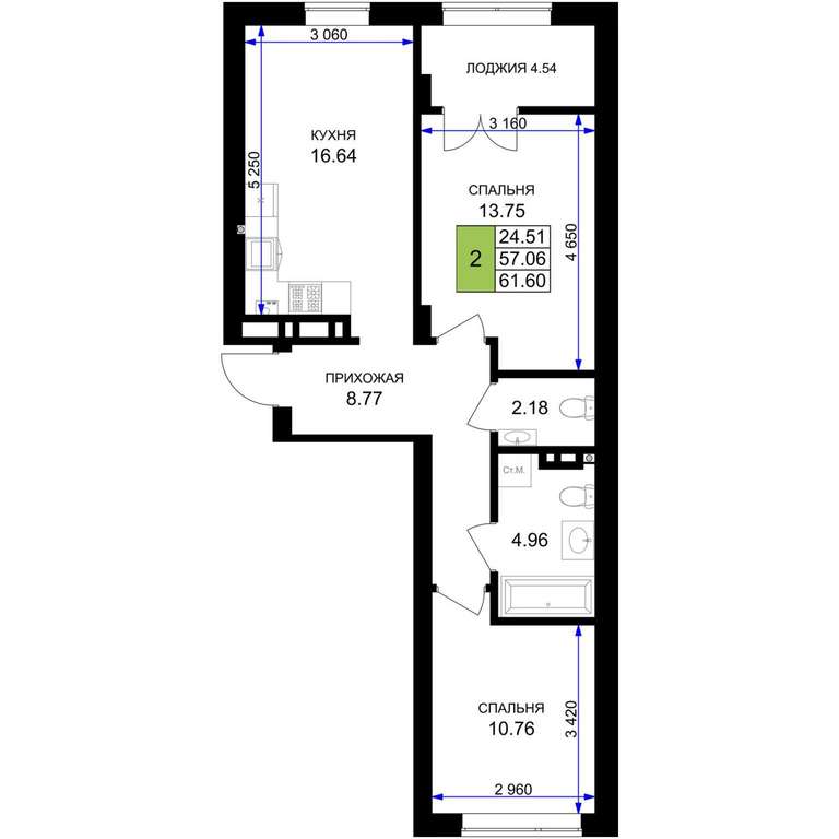 Жилая площадь 24.51 м2, кухня 16.64 м2, предчистовая отделка.