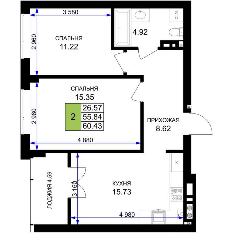 Жилая площадь 26.57 м2, кухня 15.73 м2, предчистовая отделка.