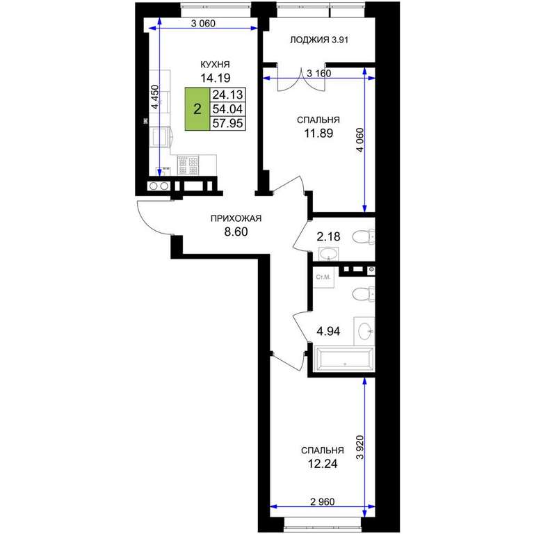 Жилая площадь 24.13 м2, кухня 14.19 м2, предчистовая отделка.