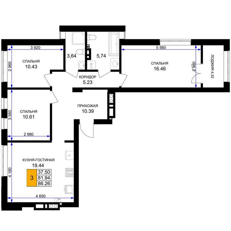 Жилая площадь 37.5 м2, кухня 19.44 м2, предчистовая отделка.