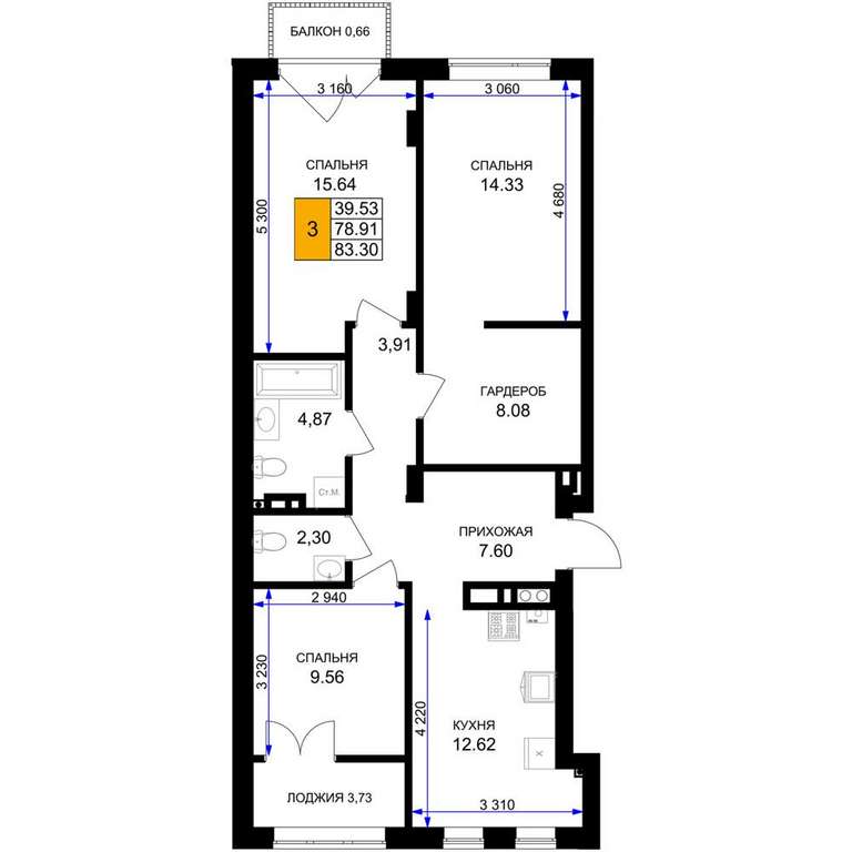 Жилая площадь 39.53 м2, кухня 12.62 м2, предчистовая отделка.