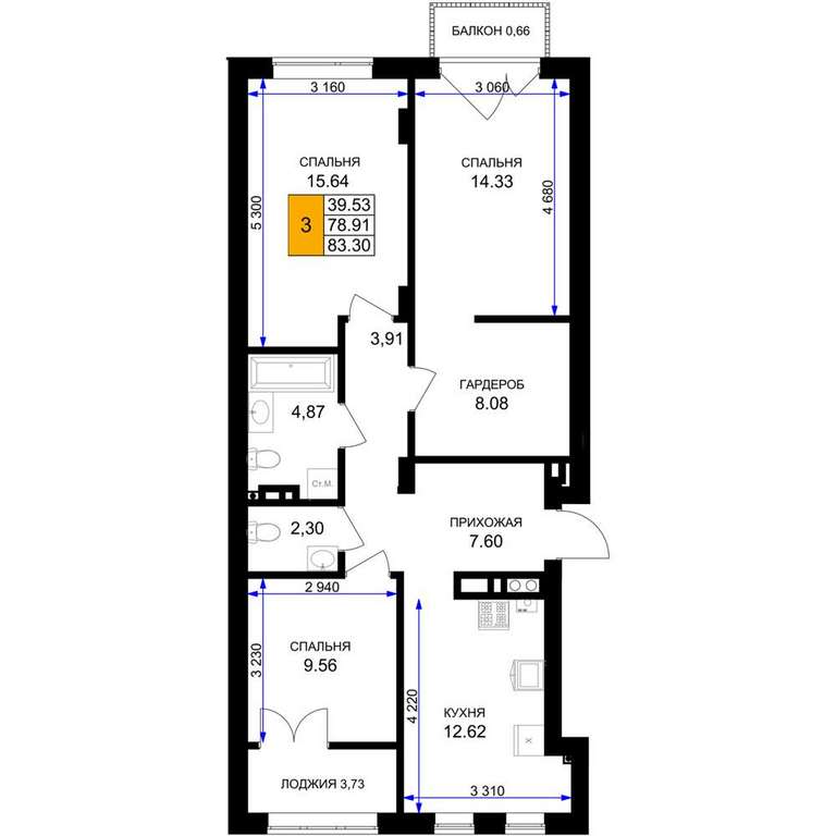 Жилая площадь 39.53 м2, кухня 12.62 м2, предчистовая отделка.