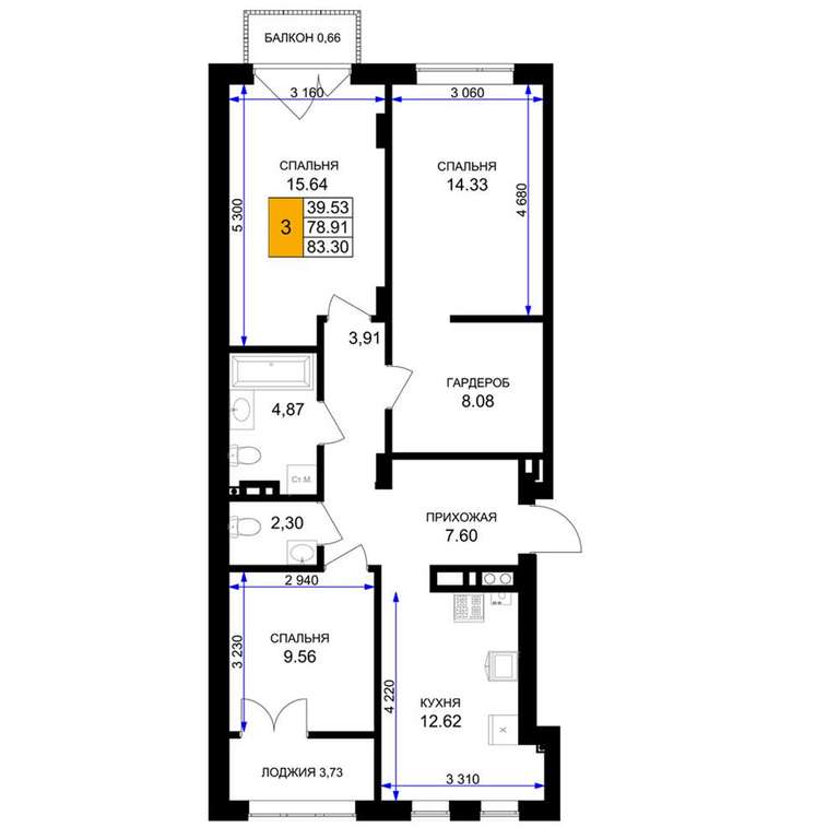 Жилая площадь 39.53 м2, кухня 12.62 м2, предчистовая отделка.