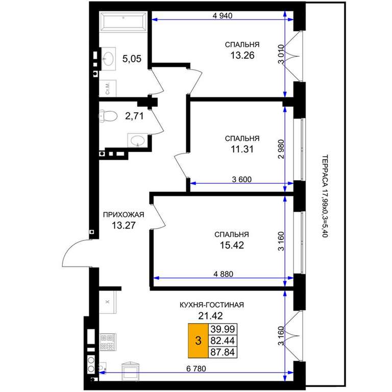 Жилая площадь 39.99 м2, кухня 21.42 м2, предчистовая отделка.