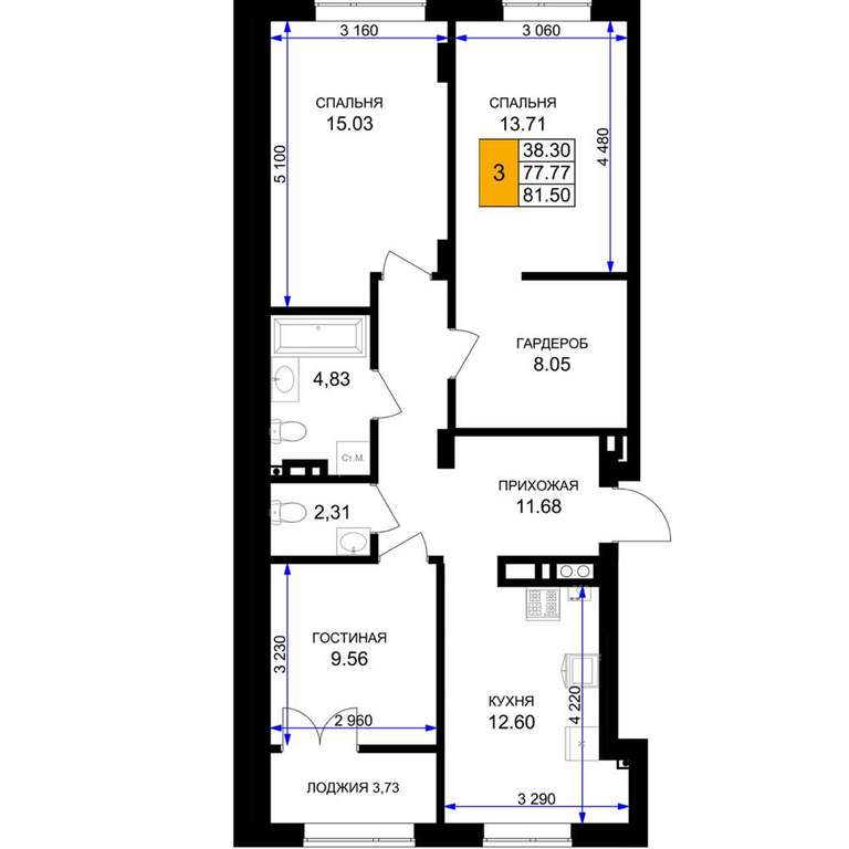 Жилая площадь 38.3 м2, кухня 12.6 м2, предчистовая отделка.