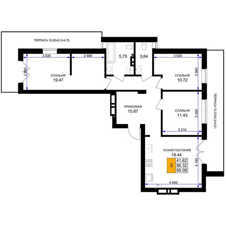 Жилая площадь 41.62 м2, кухня 19.44 м2, предчистовая отделка.