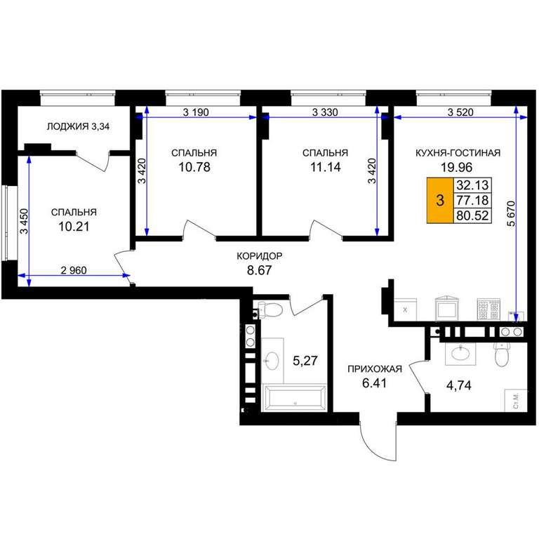 Жилая площадь 32.13 м2, кухня 19.96 м2, предчистовая отделка.