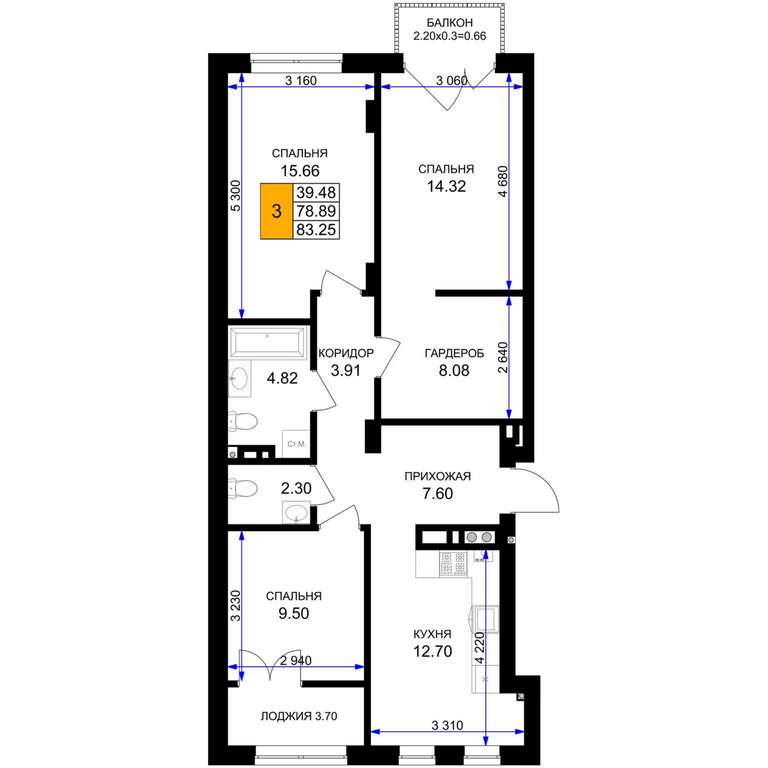 Жилая площадь 39.48 м2, кухня 12.7 м2, предчистовая отделка.