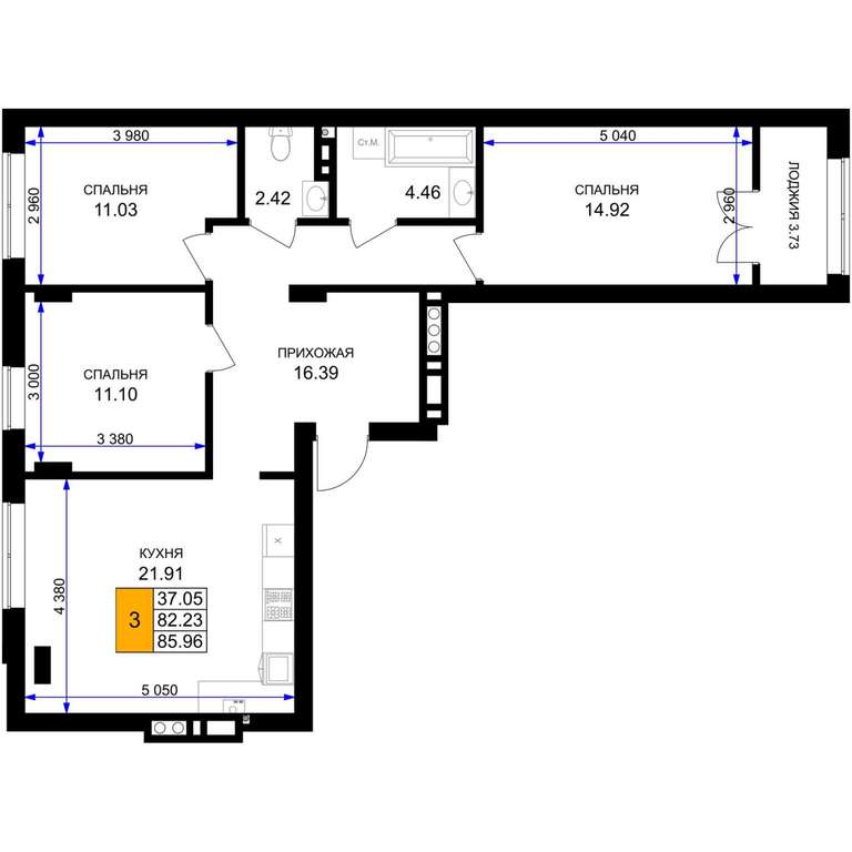 Жилая площадь 37.05 м2, кухня 21.91 м2, предчистовая отделка.
