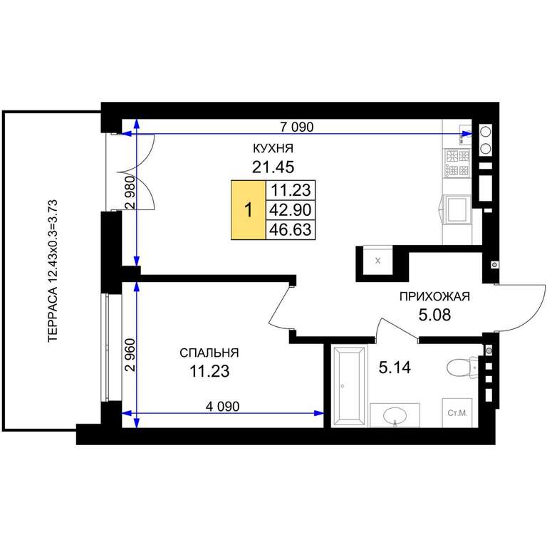 Жилая площадь 11.23 м2, кухня 21.45 м2, предчистовая отделка, комнаты изолированные.