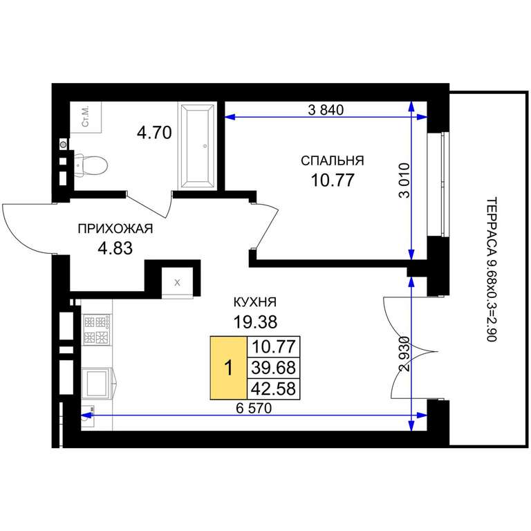 Жилая площадь 10.77 м2, кухня 19.38 м2, предчистовая отделка, комнаты изолированные.