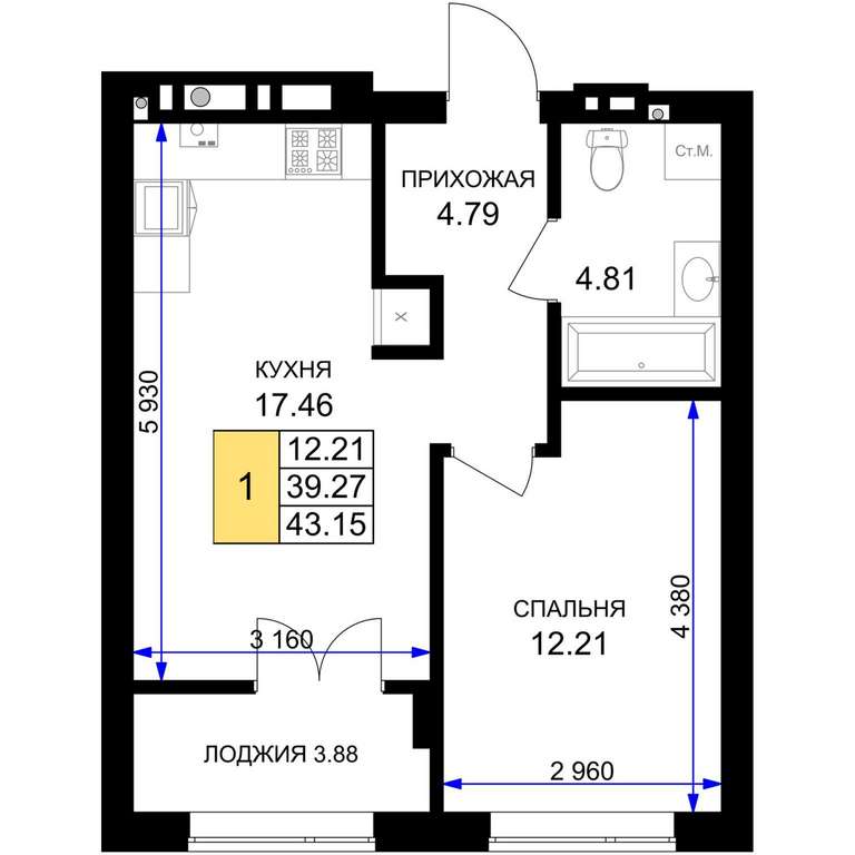 Жилая площадь 12.21 м2, кухня 17.46 м2, предчистовая отделка, комнаты изолированные.