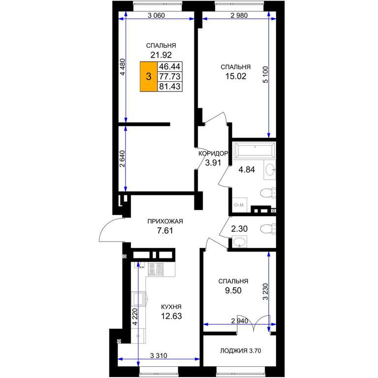 Жилая площадь 46.44 м2, кухня 12.63 м2, предчистовая отделка.