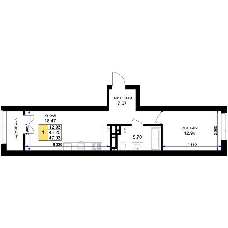 Жилая площадь 12.96 м2, кухня 18.47 м2, предчистовая отделка, комнаты изолированные.