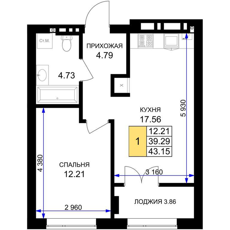 Жилая площадь 12.21 м2, кухня 17.56 м2, предчистовая отделка, комнаты изолированные.