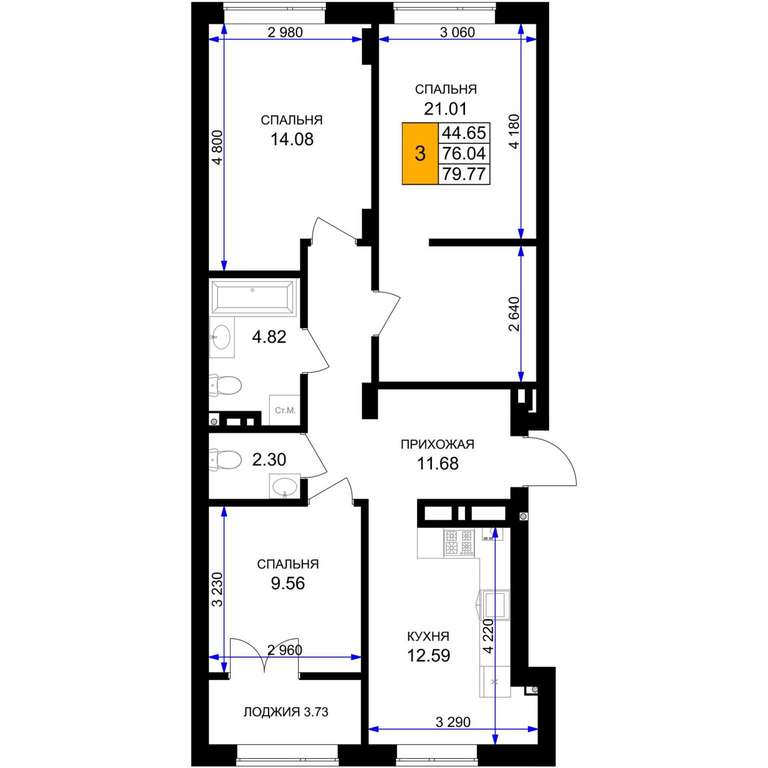 Жилая площадь 44.65 м2, кухня 12.59 м2, предчистовая отделка.