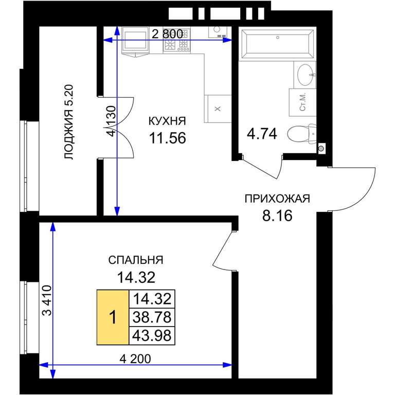 Жилая площадь 14.32 м2, кухня 11.56 м2, предчистовая отделка, комнаты изолированные.