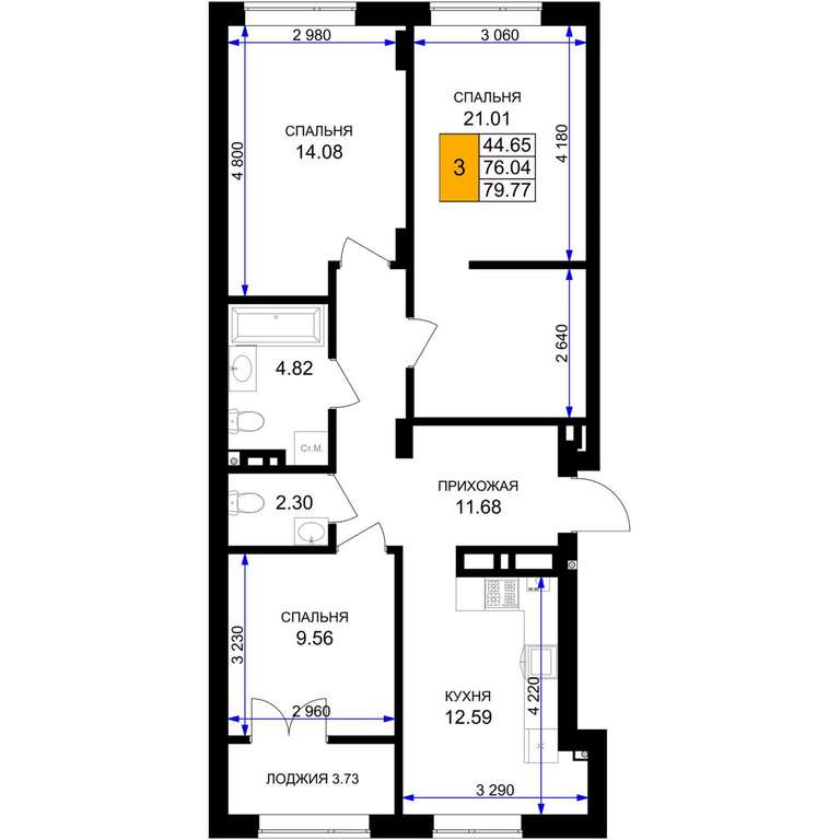 Жилая площадь 44.65 м2, кухня 12.59 м2, предчистовая отделка.