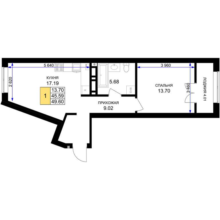 Жилая площадь 13.7 м2, кухня 17.19 м2, предчистовая отделка, комнаты изолированные.