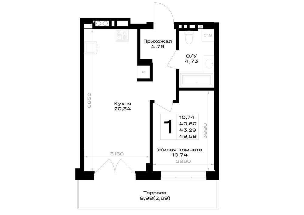 Жилая площадь 10.74 м2, кухня 20.34 м2, предчистовая отделка, комнаты изолированные.