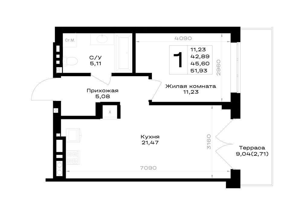Жилая площадь 11.23 м2, кухня 21.47 м2, предчистовая отделка, комнаты изолированные.