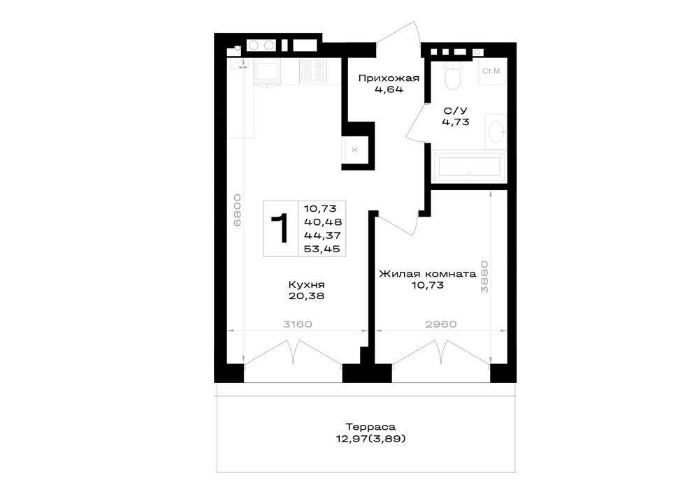 Жилая площадь 10.74 м2, кухня 20.34 м2, предчистовая отделка, комнаты изолированные.