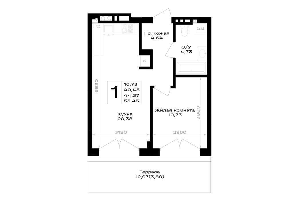 Жилая площадь 10.73 м2, кухня 20.34 м2, предчистовая отделка, комнаты изолированные.