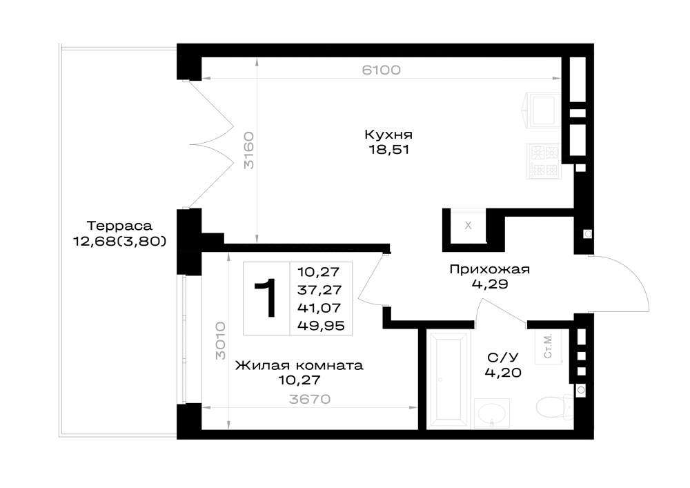 Жилая площадь 10.27 м2, кухня 18.51 м2, предчистовая отделка, комнаты изолированные.
