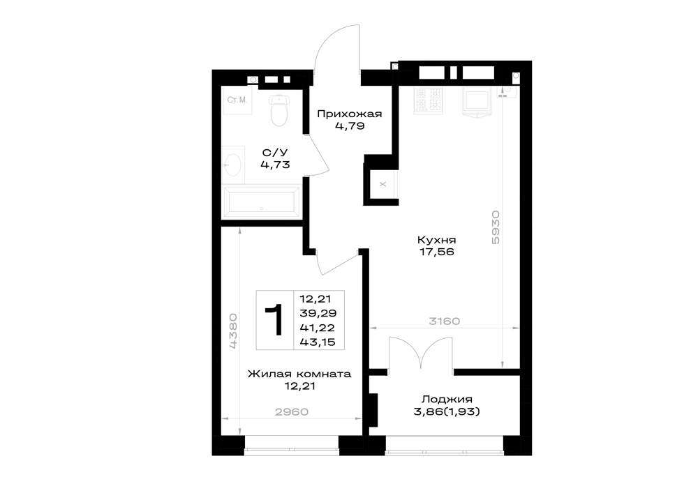 Жилая площадь 12.21 м2, кухня 17.56 м2, предчистовая отделка, комнаты изолированные.