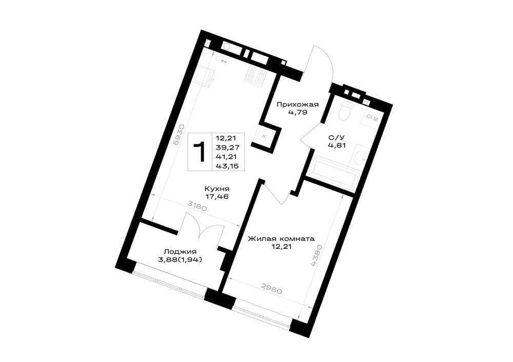 Жилая площадь 12.21 м2, кухня 17.46 м2, предчистовая отделка, комнаты изолированные.