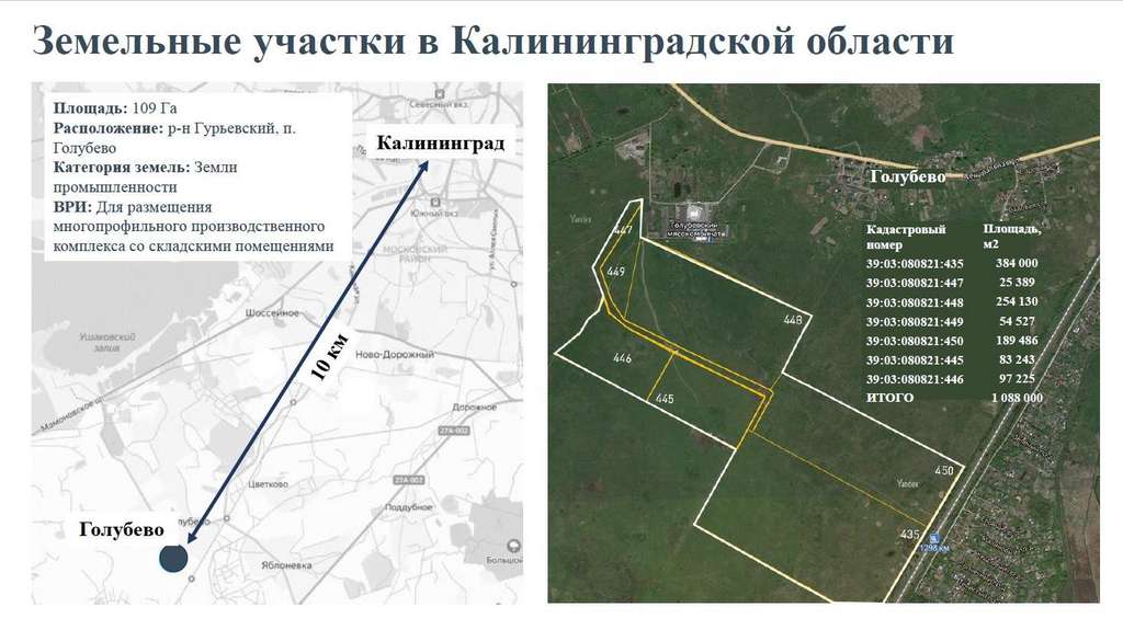 Реализуются единым лотом 7 земельных участков для размещения многопрофильного производственного комплекса со складскими помещениями. Участки смежные и свободны от каких-либо построек. Адрес: Калининградская обл., Гурьевский р-н, п. Голубево. Общая площадь участков: 1 088 000 кв. м Категория земель: земли промышленности; Разрешенное использование: для размещения многопрофильного производственного комплекса со складскими помещениями. Форма права: собственность Коммуникации: требуют подведения. Зонирование по Генплану: производственная зона. Зонирование по ПЗЗ: П-5 зона производственных и коммунально-складских объектов, расположенных вне границ населенных пунктов. Местоположение и транспортная доступность: Земельный участок расположен в пос. Голубево у ж/д станции «1298 км». До основной дороги около 800 м. Проход и проезд к участку свободный, осуществляется по асфальтовой дороге, частично грунтовой. До исторического центра Калининграда около 10 км. Участок возможно использовать в качестве размещения на нем производственно-складского комплекса.